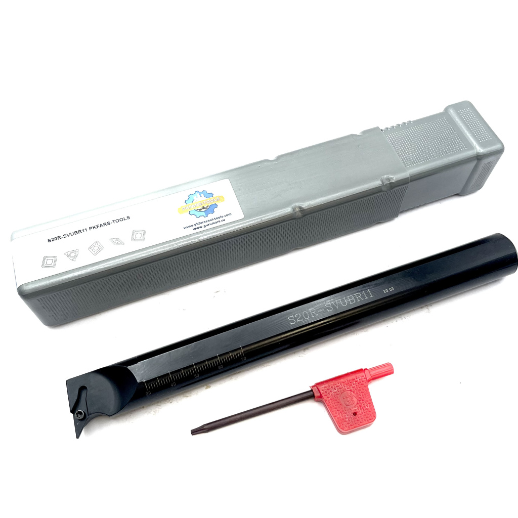 Державка (резец) S20R-SVUBR-11 со сменными твердосплавными пластинами для внутренней обработки на универсальных токарных станках и станках с ЧПУ. Предназначена для пластин VB**1103**, которые крепятся винтом. Диаметр хвостовика державки 20 мм, минимальный диаметр растачиваемого отверстия - 25 мм. R - правое исполнение.