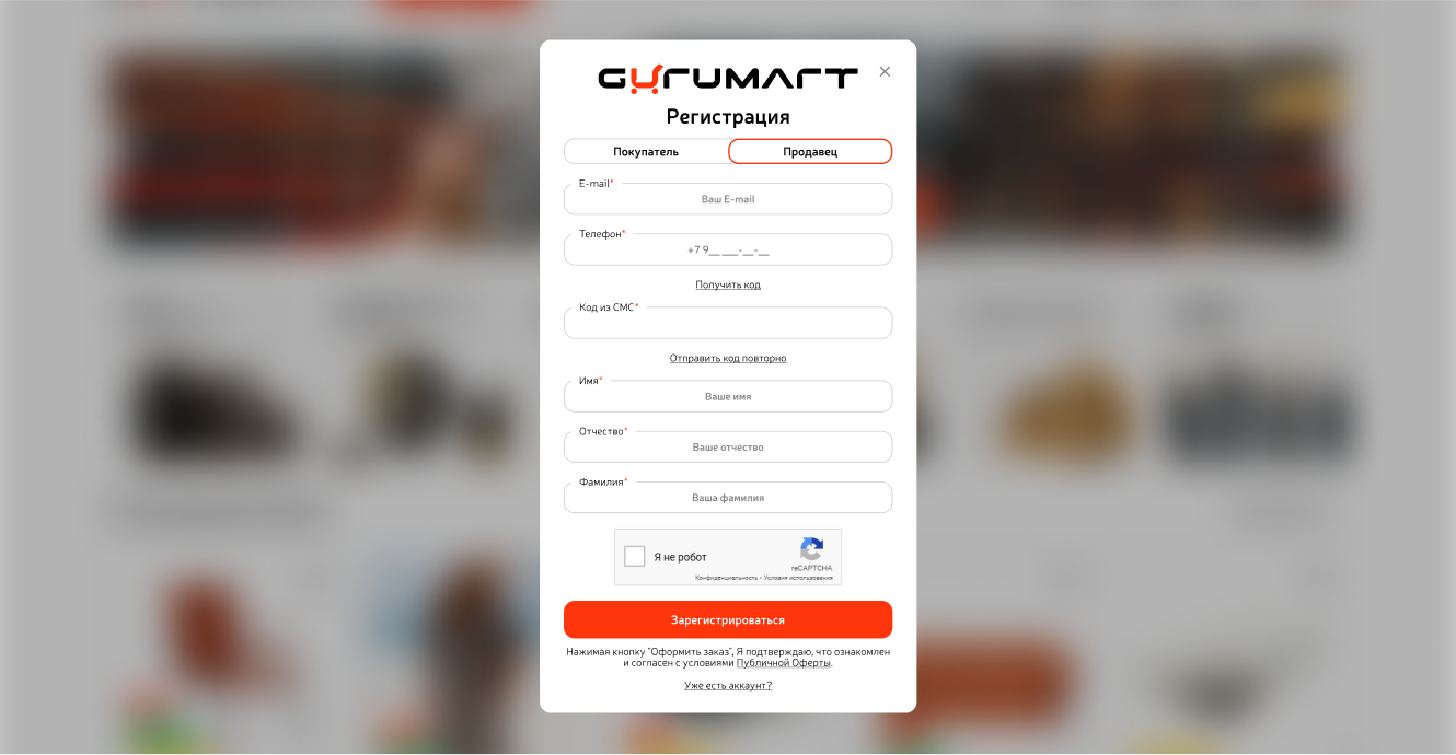 1. В форме регистрации https://gurumart.ru/personal/cart/ нажмите кнопку «Зарегистрироваться», далее «Продавец»;